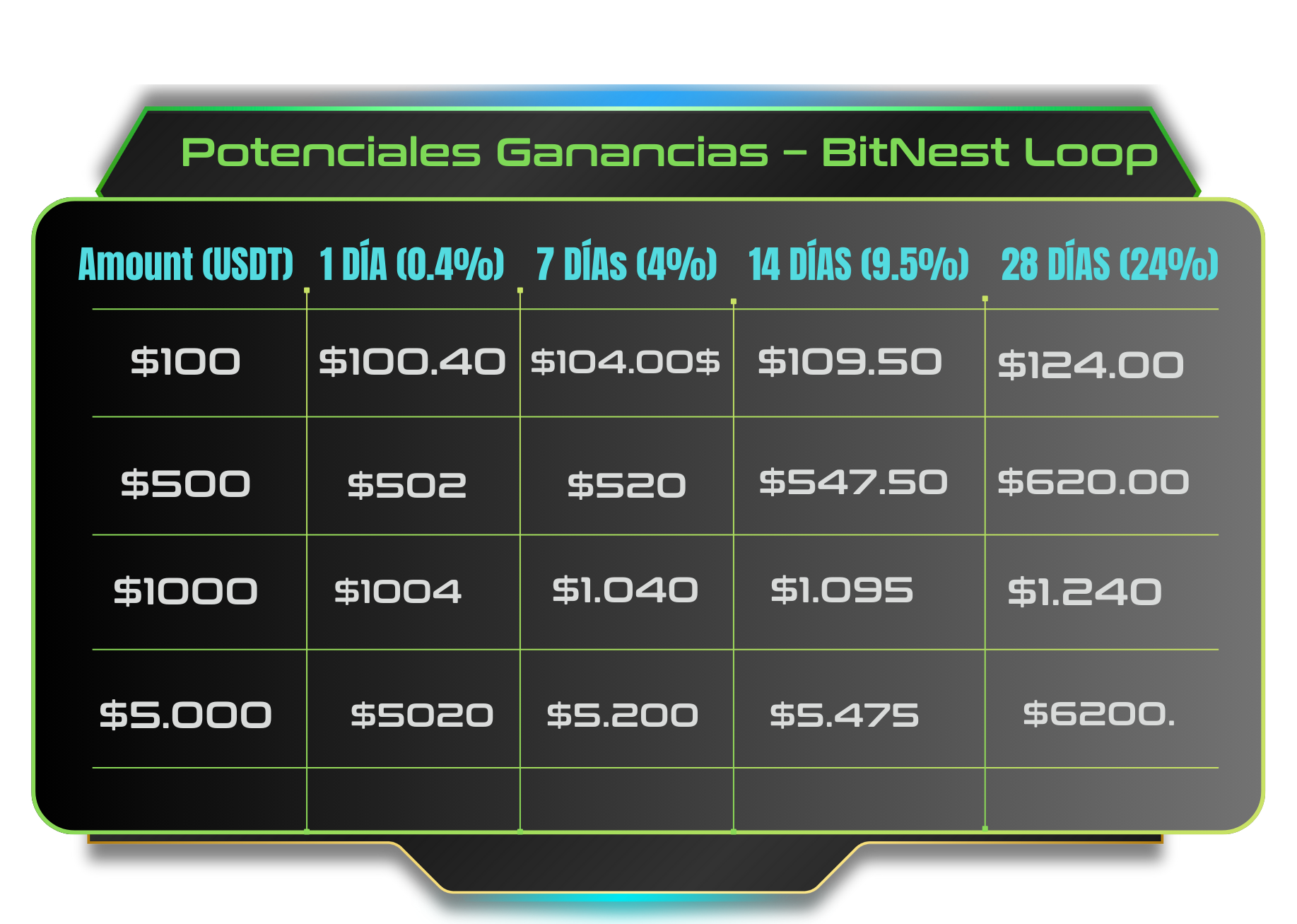 Es un Smart Contract automatizado, que coloca tu capital en ciclos de 1, 7, 14 y 28 días, generando un crecimiento progresivo. Al finalizar cada ciclo, recibes tu capital + rendimiento directo en tu wallet, sin intermediarios, tal como se muestra en pantalla.